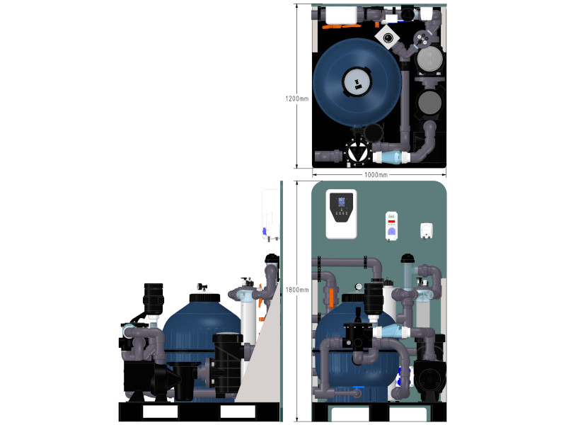 Ta filtrirni sistem je popolnoma predmontiran na plastični paleti z HDPE zadnjo stranico. Potrebno je priključiti le napajalni kabel na razdelilno omarico.