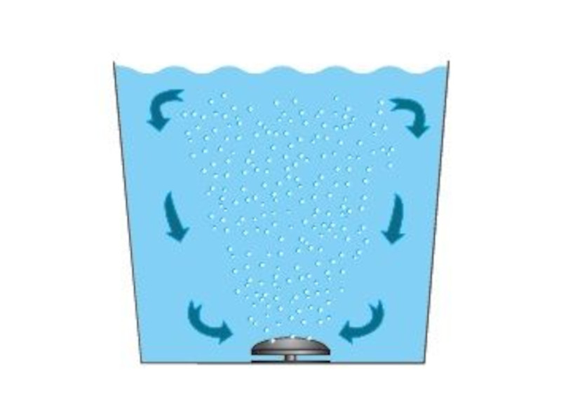 Potreben tlak za vpihovanje zraka skozi reže v membrani je le 20 mbar pri priporočenem pretoku zraka. Priporočeni pretok zraka v koi ribniku znaša 20 litrov na minuto na meter globine na zračilnik, kar zagotavlja optimalno izmenjavo kisika z vodo. Spodnja risba prikazuje, kako zračilnik povzroča učinkovito kroženje vode znotraj ribnika, kar prispeva k zdravemu okolju za ribe.