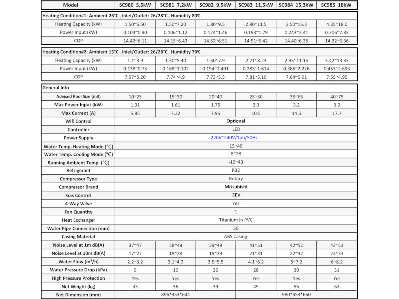 S koeficientom učinkovitosti (COP) 14,5 so te črpalke izjemno energetsko učinkovite, kar omogoča prihranek pri porabi energije. Poleg tega je zasnovan tako za ogrevanje kot tudi za hlajenje bazena, kar zagotavlja nadzor nad temperaturo v vseh popolnih letnih časih.