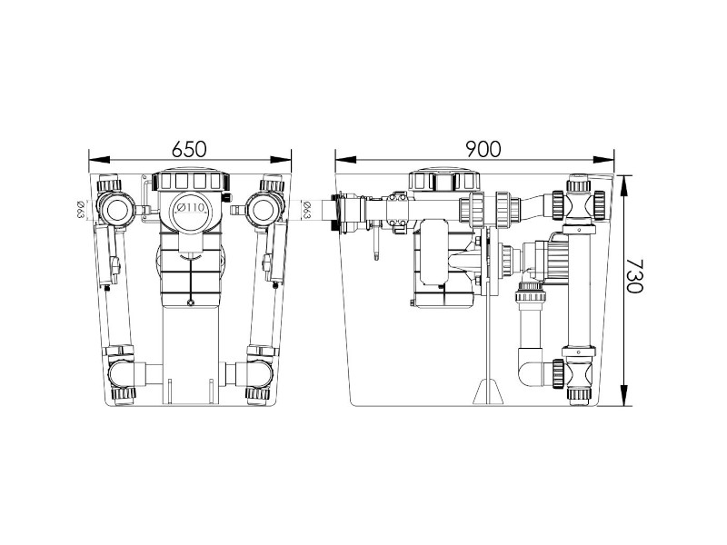 2 x izhod 63 mm (ločeno nastavljivo z žogastim ventilom premera 63 mm)