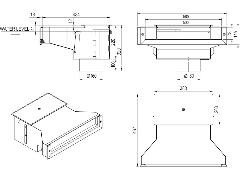 Nima zapiralne flanše na vrhu, zato ga je mogoče postaviti ob robni kamen. Vodna linija je lahko do 41mm pod pokrovom! Lahko se neposredno poveže z AquaForte Skimmersieves (z vhodom Ø160mm) ali pa se enostavno poveže z adapterji 160-110mm z drugimi sitami. Popolnoma izdelan iz nerjavečega jekla 316. Širok vhod skimmerja meri 500mm.