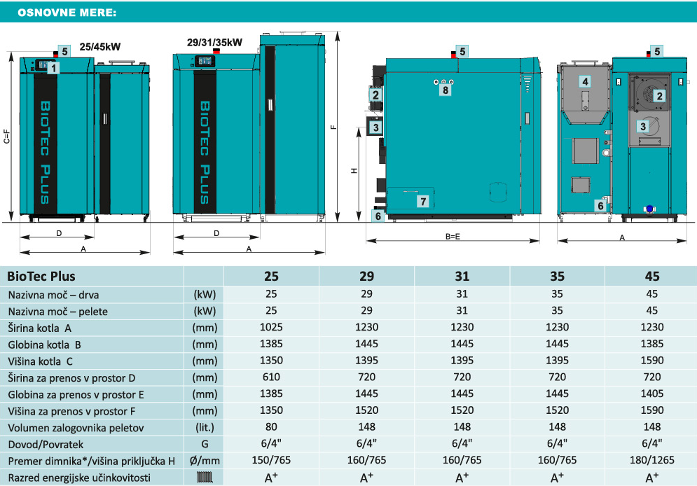 Kotel BioTec Plus z nazivnim toplotnim učinkom 25, 29, 31, 35 in 45 kW je kotel z dvema kuriščama, ki je namenjen za sežiganje lesnih peletov in polen. V kurišču za pelete je tovarniško vgrajen gorilnik za kurjenje lesnih peletov s funkcijo samodejnega čiščenja rešetk in vžiga pelet. V drugem kurišču gorijo drva s postopkom pirolize. Večfunkcijska digitalna regulacija kotla s pomočjo lambda sonde in modulirnega ventilatorja optimizira gorenje v obeh kuriščih in s tem poveča učinkovitost kotla. Zalogovnik pelet je sestavni del kotla in ga je mogoče nadgraditi s sistemom za avtomatsko vakuumsko dovajanje pelet.