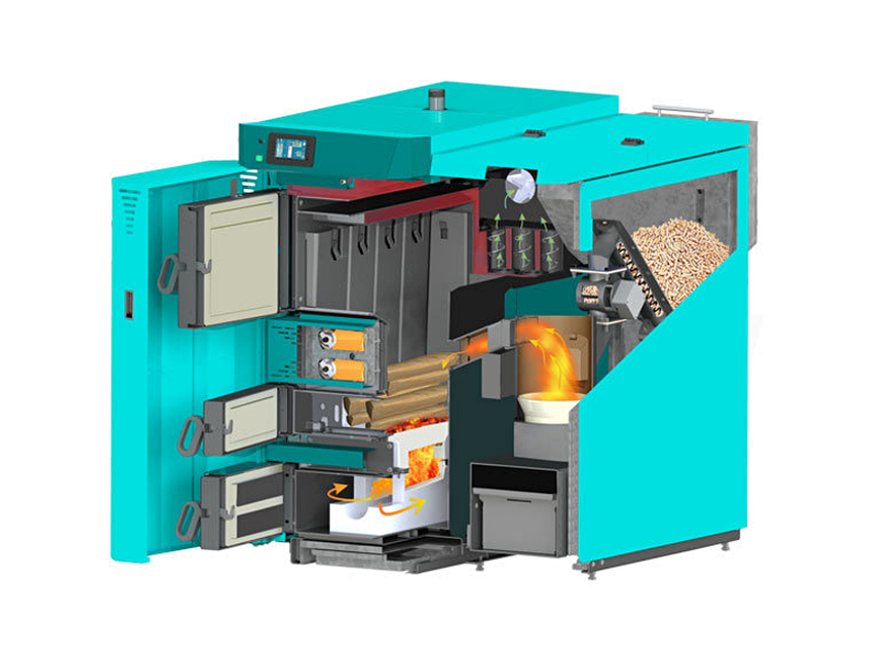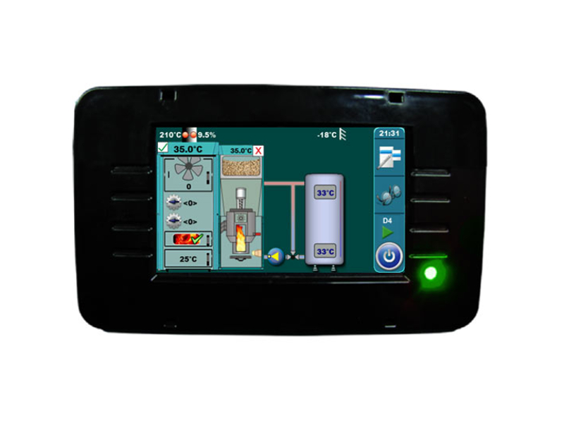 - večfunkcijska digitalna regulacija z barvnim zaslonom na dotik vodi proces pirolize v kotlu za polena in avtomatsko vklopi stran kotla za pelete, ko v kotlu ni več polena