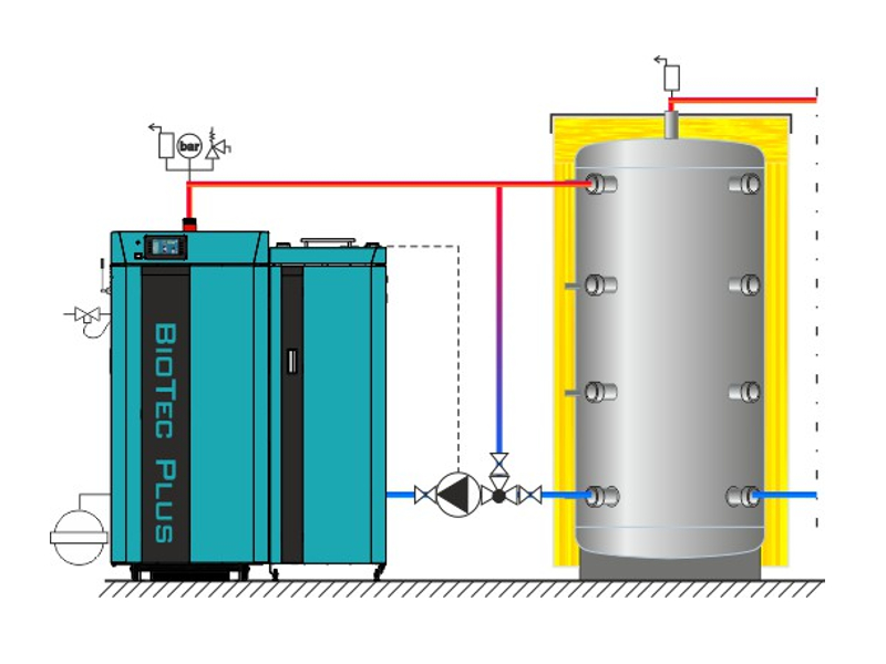 - kotel je namenjen za vgradnjo v odprte ali zaprte ogrevalne sisteme izključno preko akumulacijskega zalogovnika (CAS), minimalna prostornina znaša 50 lit /kW.