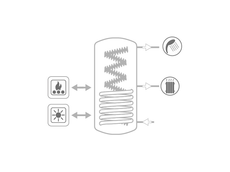 Zalogovnik ECO COMBI 2 ima vgrajeno eno spiralno cev iz nerjavnega jekla INOX 316 L za sanitarno vodo in en dodatni izmenjevalec za ogrevanje z drugim virom. Uporablja se v enotah s prekinjenim energetskim virom z dvojnim namenom: