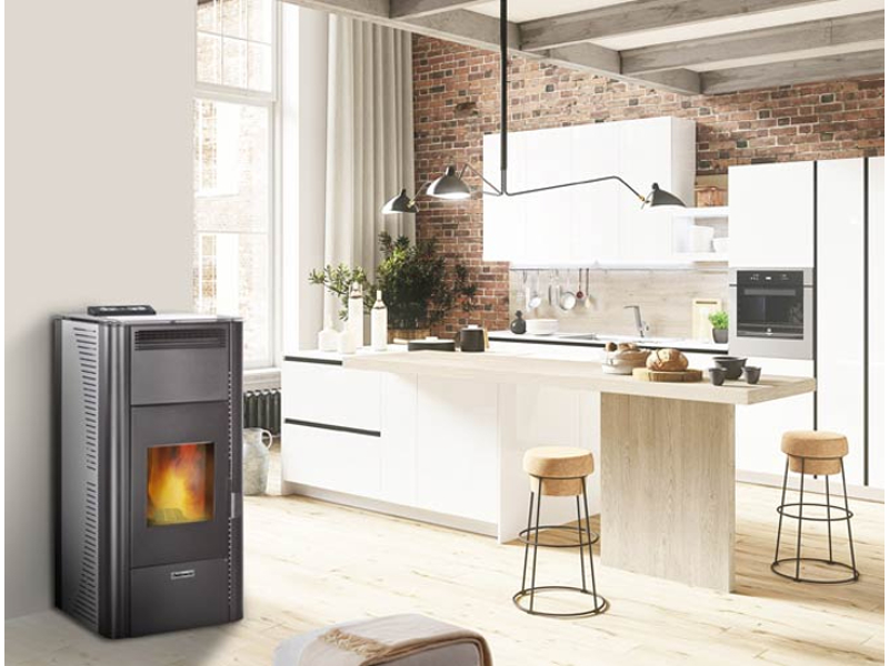 - kaminska peč na pelete je namenjena za zračno in vodno ogrevanje prostorov z vpihovanjem toplega zraka v prostor in s priklopom na radiatorje