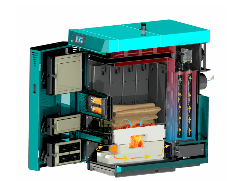 - Sodoben kotel, v katerem s postopkom pirolize gorivo temeljito izgoreva. Temeljito izgorevanje potrebe po čiščenju, ki ga je potrebno izvesti vsake 3-4 dni, če kotel dela z maksimalno močjo ali redkeje, če je kotel manj obremenjen.