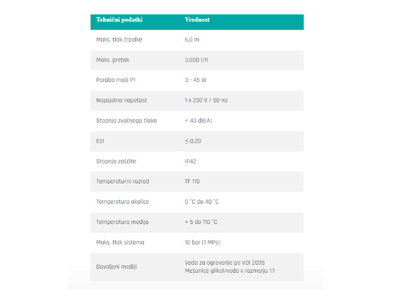 • funkcija avtomatskega prilagajanja moči črpalke glede na spremembo pretoka v sistemu