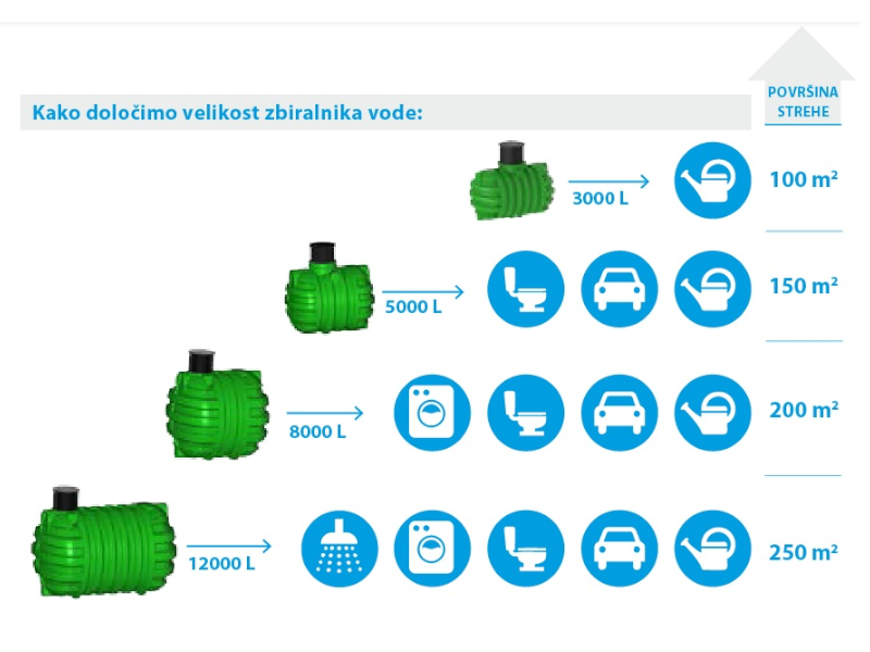 Zbiralniki deževnice so izdelani iz polietilena in so predvideni za vkop v zemljo. Zbrano deževnico lahko uporabljamo za zalivanje vrta, pranje perila, avtomobila, spiranje sanitarij, tuširanje in drugo. V zbiralnikih lahko shranjujemo tudi pitno ali izvirsko vodo.