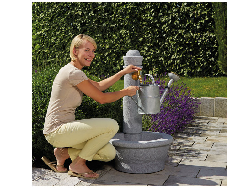 Pripraven način za dostop do vode na vašem vrtu - PVC stebričasti priključek v imitaciji kamna z lijakom in kromirano pipo. Na voljo v sveto sivi ali rdeči barvi.