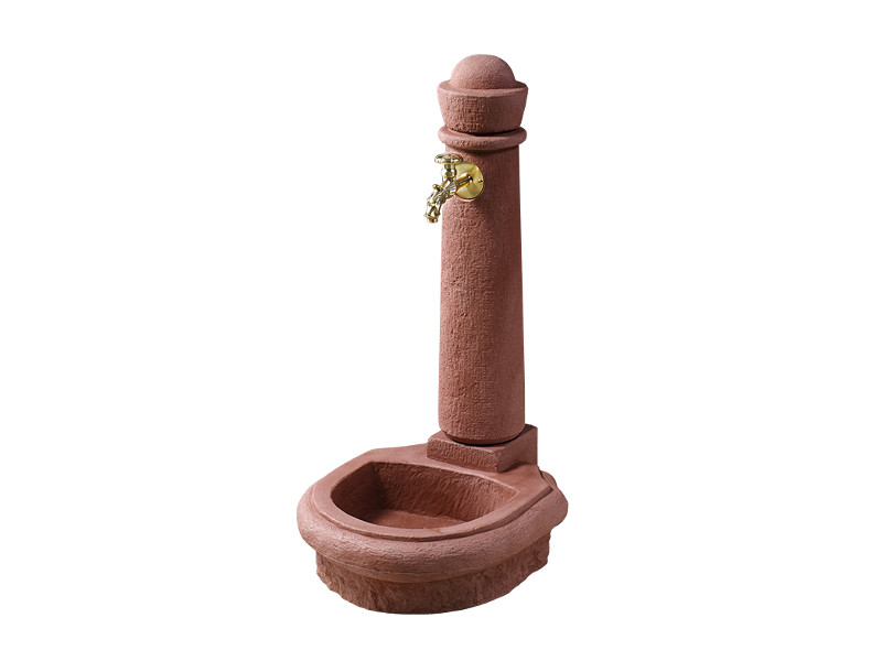 Pripraven način za dostop do vode na vašem vrtu - PVC stebričasti priključek v imitaciji kamna z lijakom in kromirano pipo. Na voljo v sveto sivi ali rdeči barvi.