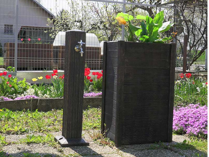 Stebriček je izdelan v odlični imitaciji lesa, z majhno maso in ima dolgo življensko dobo. Potrebno ga je le pritrditi na površino z vijaki in pripravljen je na uporabo. Priklop vode je mogoč od vznožja, po notranjosti stebrička, do zgornje odprtine. Na voljo imamo tudi veliko izbiro dodatne ponudbe - kromirana pipa, medeninasta, pvc - vse kar potrebujete za funkcionalnost in izjemen izgled.