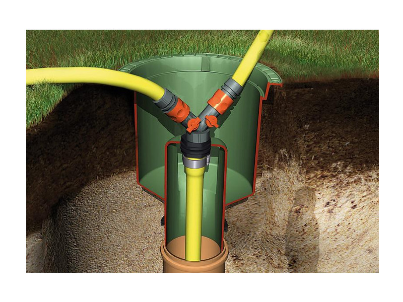 Jašek za udoben odvzem vode na vašem vrtu, vključno z Gardena 2-potnim ventilom in priključkom za cev 1".